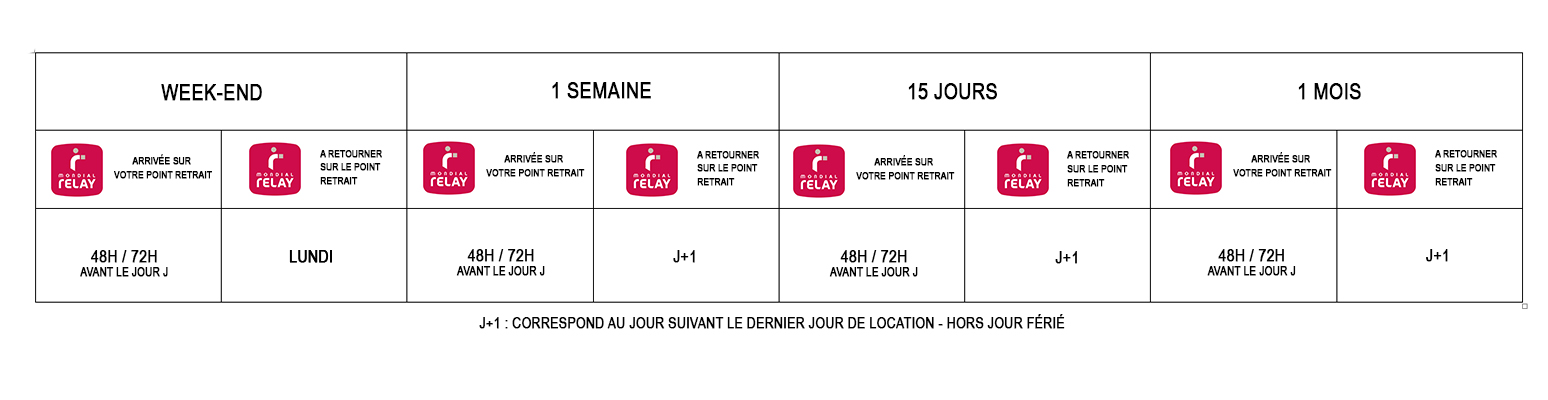 Afin de vous aider à prévoir le bon forfait de location, voici les informations sur les durées de location sur service Mondial Relay et Retrait sur nos deux points retrait.