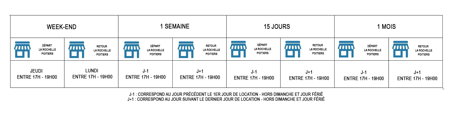 Pour toutes commandes réalisées sur retrait sur La Rochelle, le retour devra s'effectuer au plus tard le Lundi.